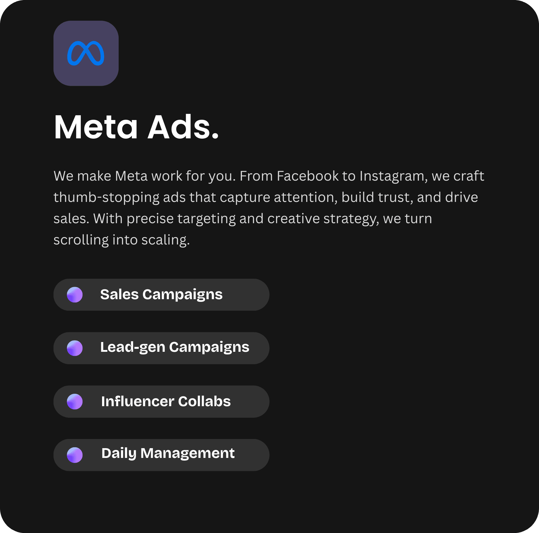 We scale brands with data-driven ads, bold strategy, and measurable ROI.